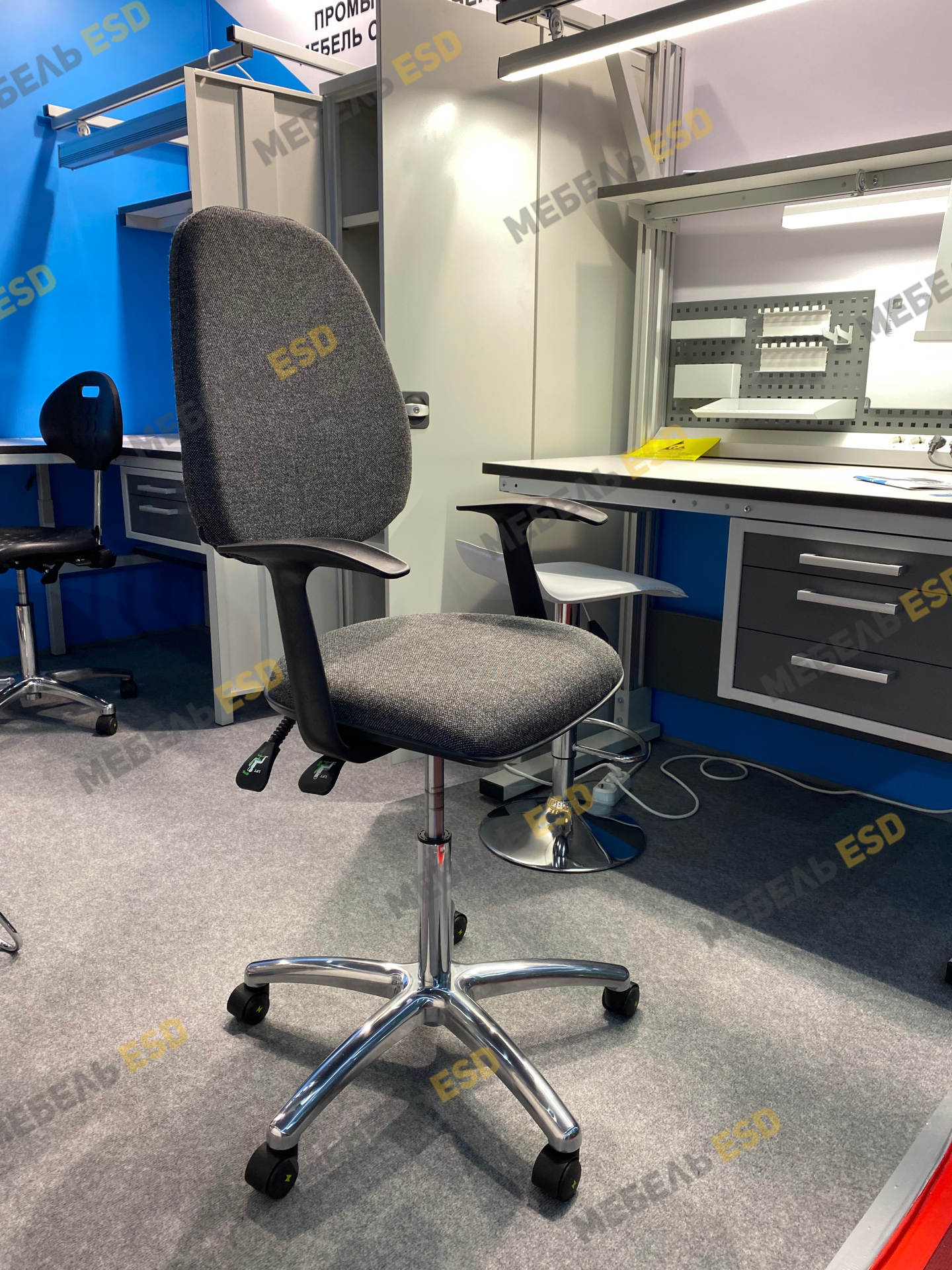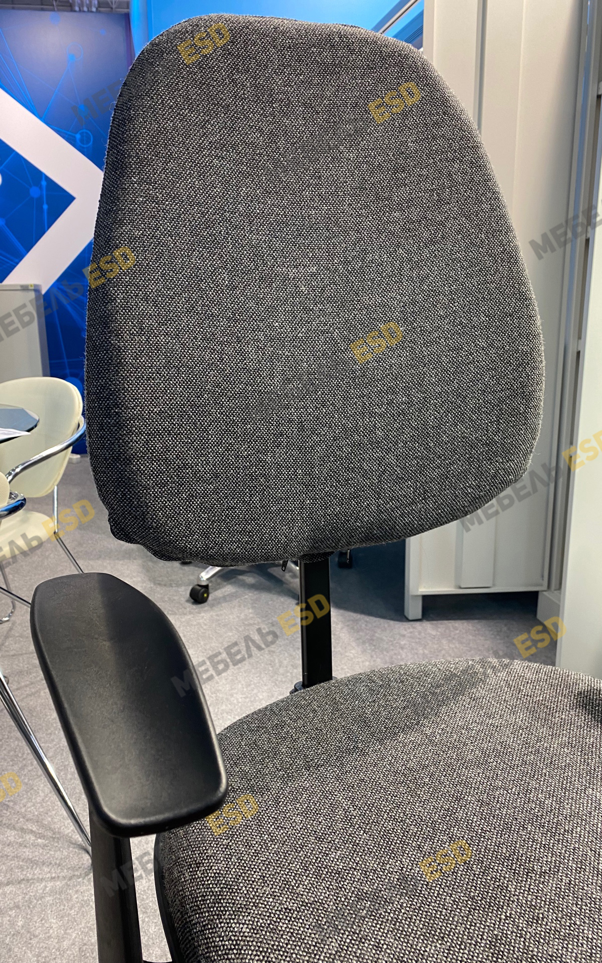 На выбор возможна комплектация антистатическими ножками или антистатическими колесиками. Дополнительно можно заказать антистатические подлокотники, опорное кольцо для ног. Имеется регулировка угла наклона сиденья и угла наклона спинки.