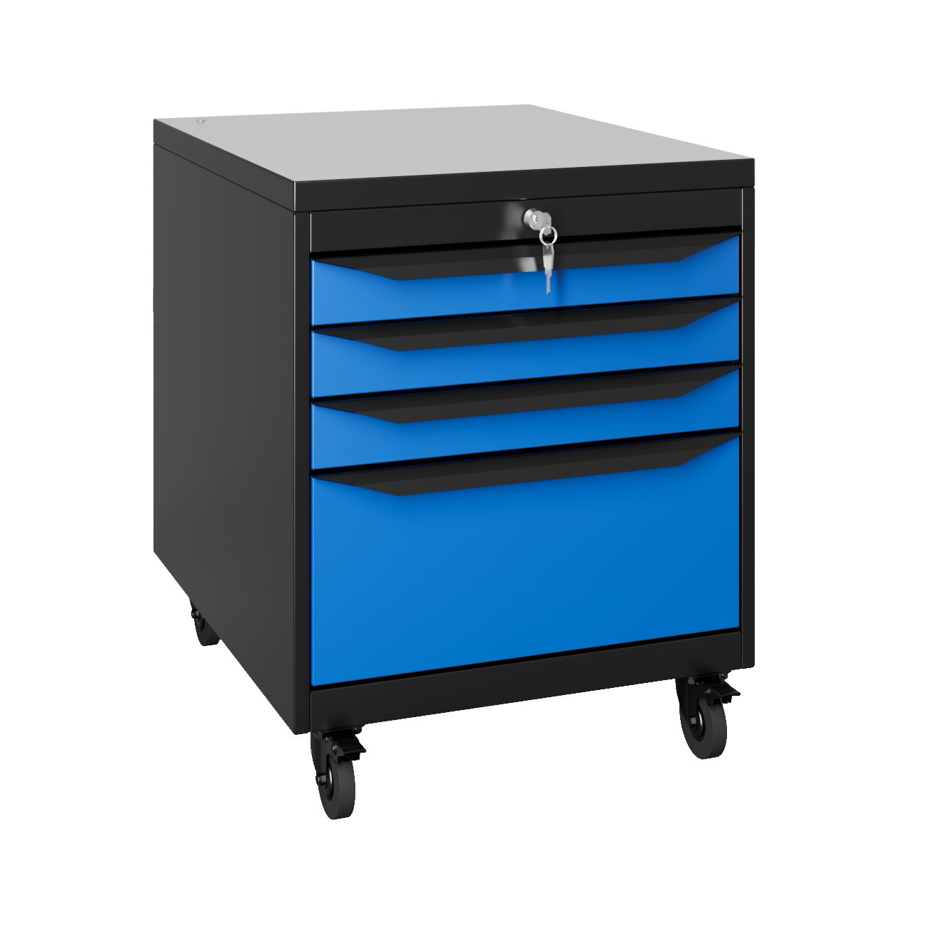 Окраска элементов корпуса осуществляется порошковой антистатической краской: RAL 9011 (темный графит), дверцы RAL 5023 (синий), столешница RAL 7047 (серый).