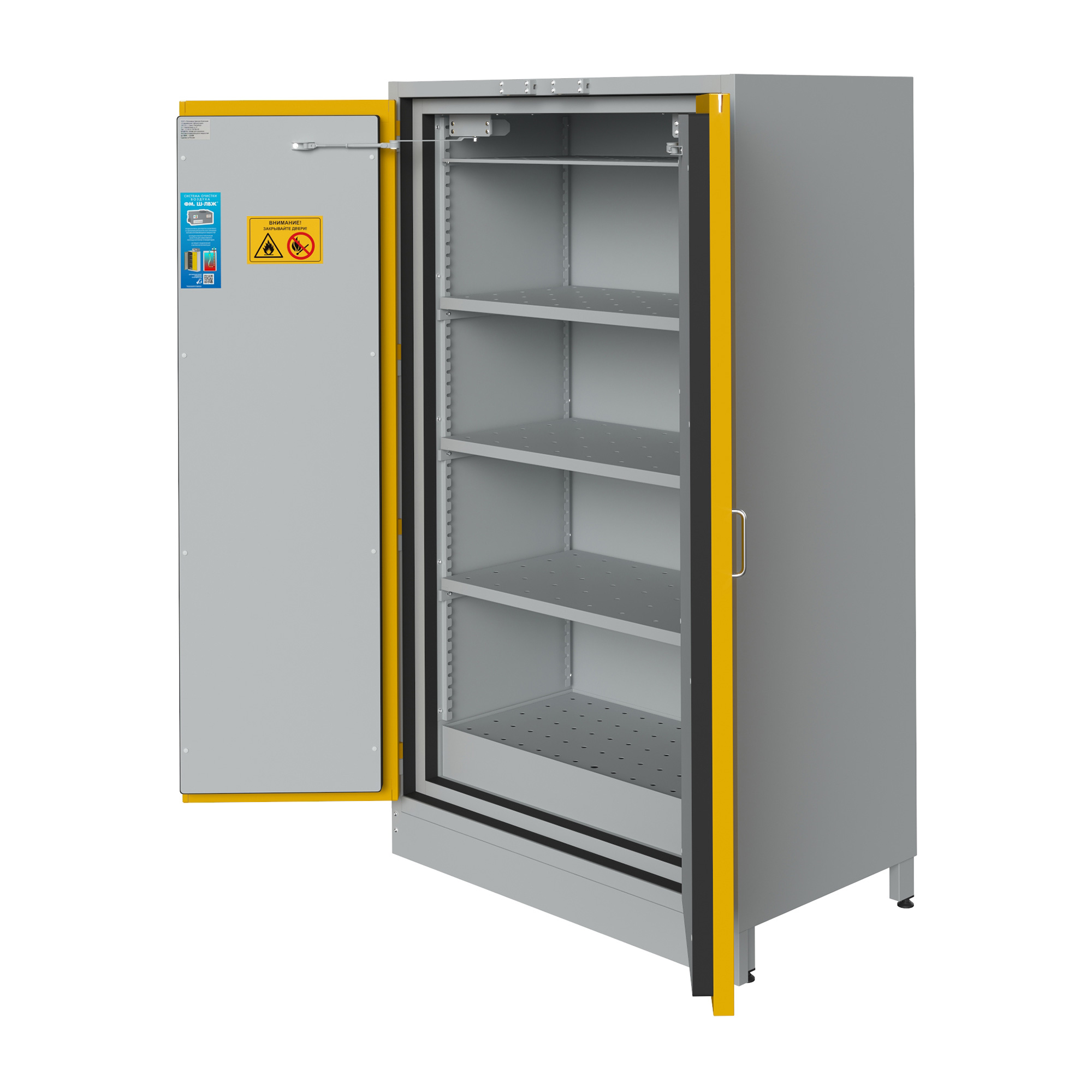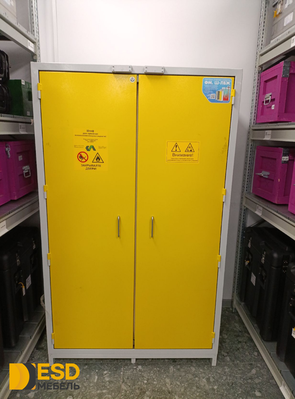 Испытания шкафа для хранения ЛВЖ на возгорание были произведены в аккредитованных лабораториях, в соответствии со стандартом ГОСТ  Р 50862-2017. Шкаф изготовлен из стали толщиной 1,2 мм с и окрашен противокислотной порошковой эпоксидной краской,  при температуре полимеризации 200° C. Толщина слоя краски составляет минимум 60 (микрон) и максимум 250  (микрон), в соответствии с требованиями ГОСТ  9-410-88 .Шкаф для хранения ЛВЖ обладает монолитной цельносварной конструкцией. Новая техника изготовления с двойной оболочкой, состоящей из двух корпусов, внутреннего и наружного. Новая огнеупорная изоляция, выполненная из экологически безопасного материала, характеризующегося высочайшей огнеупорностью.  Внутренний корпус с панелями из не царапающегося материала, устойчивого к действию коррозийных веществ.  Терморасширяющаяся прокладка 7 + 4 см, увеличивающаяся в объеме в случае пожара, полностью изолируя внутреннюю часть шкафа от внешней среды. Дополнительная терморасширяющаяся прокладка для защиты от пыли с защитой от “холодных и горячих дымов”.  Распашные дверки, поддон для хранения  из окрашенной эпоксидной порошковой краской электрооцинкованной стали, с противокислотной защитой, с решеткой, выполняющей роль полки. Объем сбора около 5 литров, грузоподъемность полки кг 80.  Закрытие распашной двери шкафа для хранения лвж с автоматическим возвратом при каждом открытии. Система внутренней не форсированной вентиляции для паров, укомплектованная двумя предохранительными клапанами с автоматическим закрытием при температуре окружающей среды 70 ± 10° C, находящимися внизу и вверху, чтобы гарантировать автоматический выход наружу веществ, в соответствии с требованиями норматив. Наружный соединительный фланец для подключения к системе вытяжной вентиляции, диаметром 100 мм. Система предохранительного закрытия , автоматически срабатывающая и удерживающая дверь закрытой в случае пожара.  Искробезопасные петли, расположенные по длине двери.  Предохранительный цилиндровый замок, запирающийся на ключ. Плакаты, предупреждающие об опасности наличия возгораемых веществ и запрете курения, в соответствии с российскими и европейскими нормами безопасности.  Клемма заземления на случай возникновения электростатического электричества.   Регулируемые ножки для установки шкафа в горизонтальное положение.  Руководство по эксплуатации и техобслуживанию.