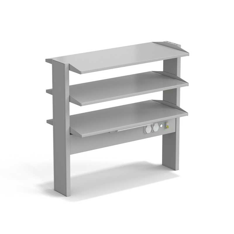 Стеллаж островной предназначен для комплектации пристенных столов и служит для увеличения рабочей площади стола, ярусности размещения лабораторного оборудования и лабораторной посуды.
