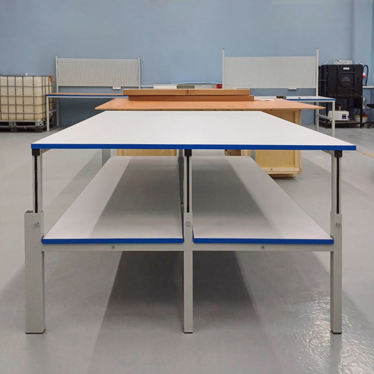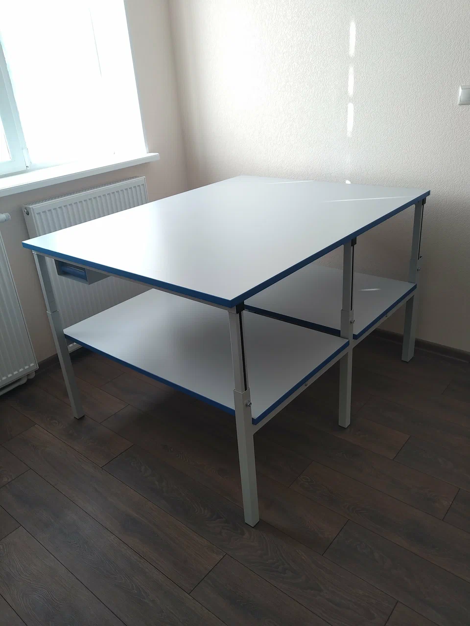 Для хранения и размещения рулонных материалов предусмотрена нижняя полка во всю ширину стола. Раскройный стол СР легко выдерживает нагрузку в 300 кг. Конструкция стола СР имеет регулировку высоты столешницы 650-950 мм., что позволяет установить её на любую удобную Вам высоту, а в последствии , если это необходимо, легко поменять. Столешница и полка изготовлены из ЛДСП толщиной 25 мм. Все рабочие места Gresson серии СР могут быть оборудованы регулируемыми опорами, что позволит нивелировать неровность пола и при необходимости увеличить высоту стола.