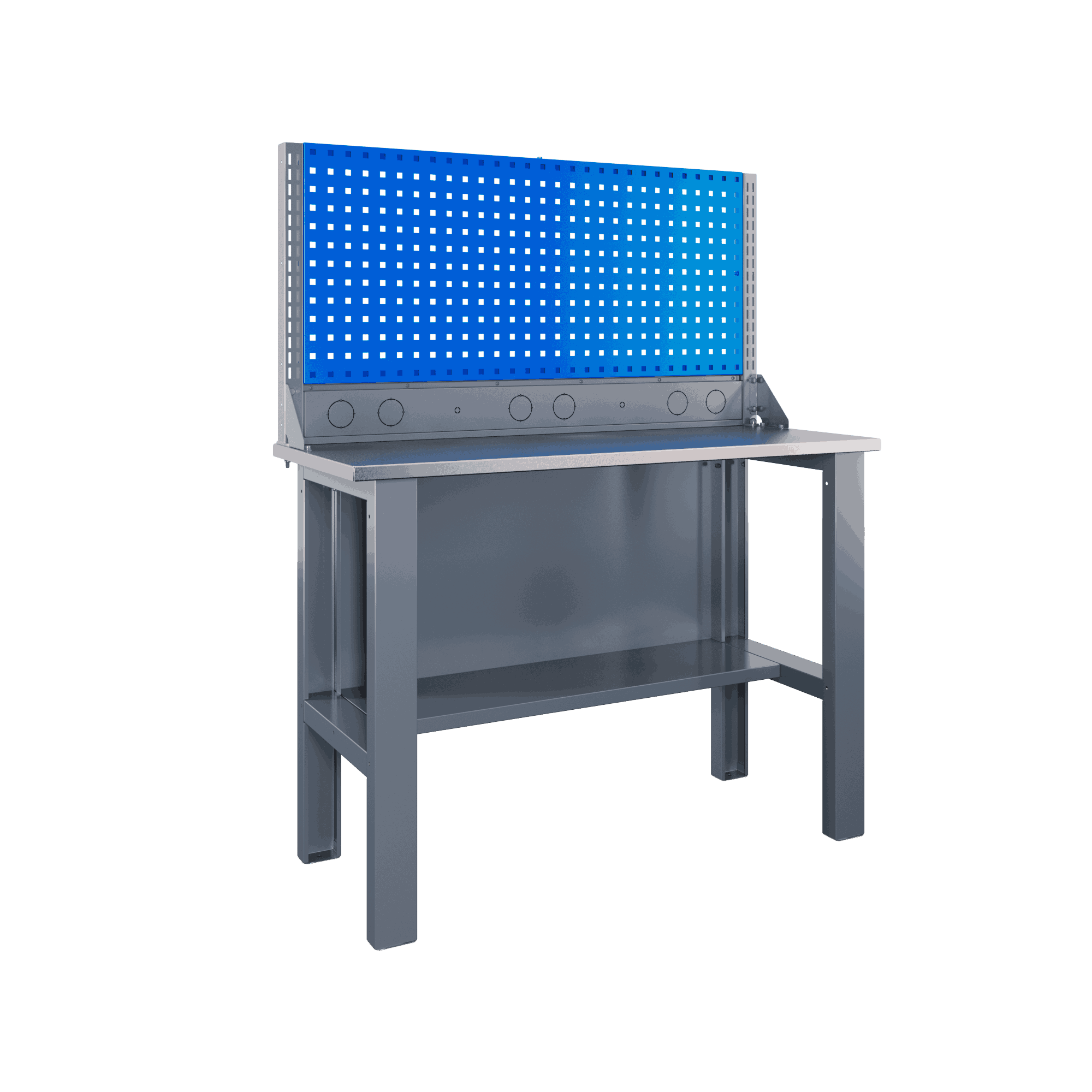 Бестумбовая конструкция (габариты 1473×1200×500 мм) обеспечивает свободный доступ к рабочей зоне и оснащена полкой-стенкой для удобного хранения мелочей. Вес стола всего 41,52 кг, но при этом он стабилен и рассчитан на 7 лет активной эксплуатации. Производство – Россия, гарантия 3 года. Отсутствие регулировки высоты (855 мм) компенсируется универсальным дизайном, подходящим для сборки, ремонта, работы со станками и тисками.