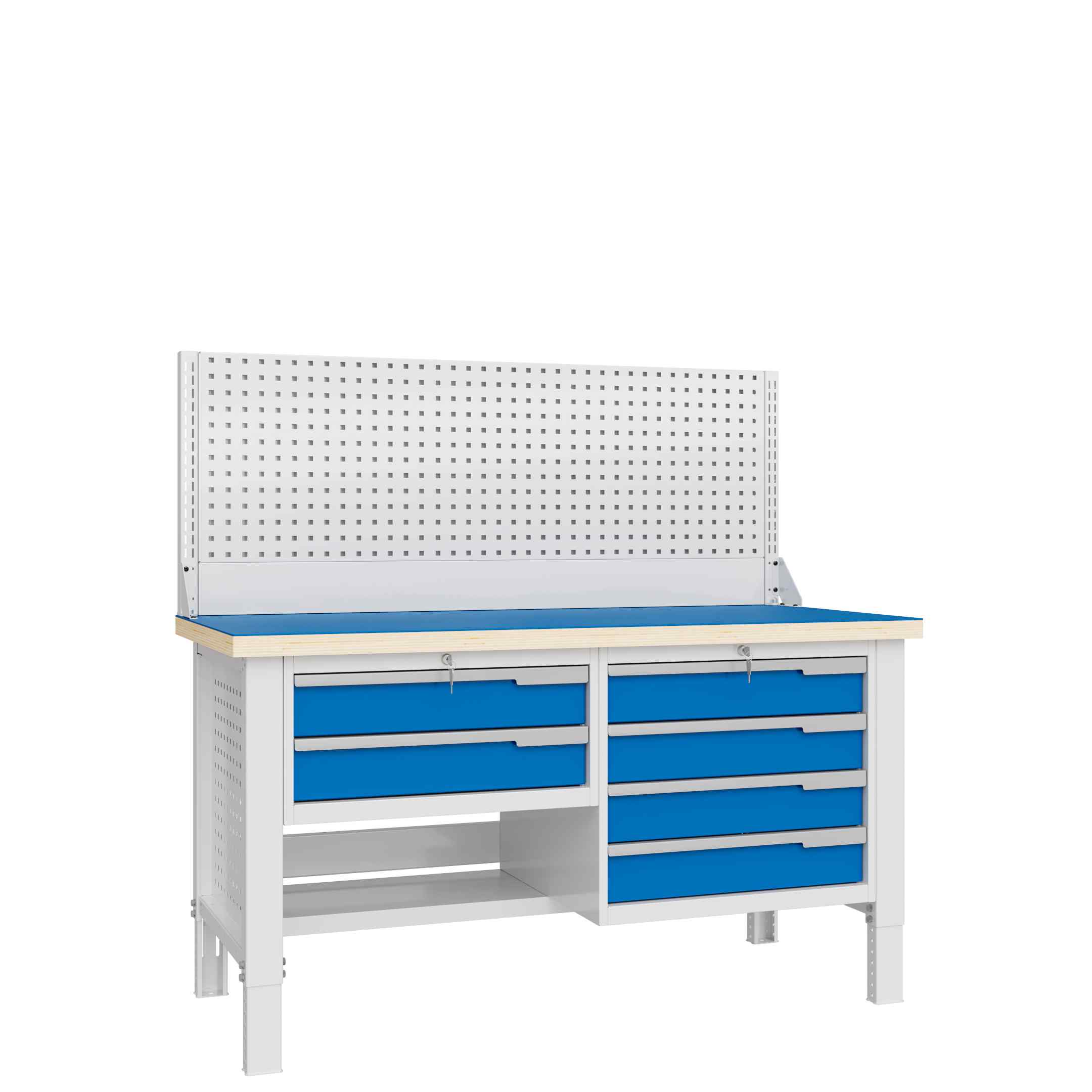 Регулировка рабочего места по высоте осуществляется в диапазоне от 700 до 950мм с шагом 25мм. Предусмотрена возможность тонкой регулировки усиленным резьбовым подпятником. Нагрузка на ящики верстака - до 40 кг, на полки - до 60кг. Общая распределенная нагрузка на рабочую поверхность 1500кг. Имеет возможность стыковки в единую рабочую поверхность с верстаками серии Constructor