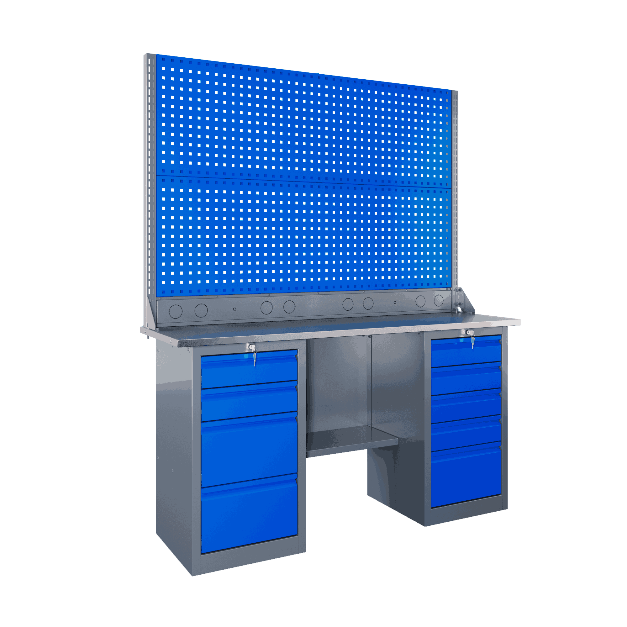 Ищете профессиональное рабочее место, которое выдержит серьёзные нагрузки? Верстак SLF 161.45.1-2R от бренда «Верстакофф» – идеальное решение для интенсивной работы. Эта двухтумбовая модель рассчитана на распределённую нагрузку до 500 кг и оснащена усиленной столешницей из фанеры 24 мм с оцинкованным стальным покрытием 1,2 мм. Перфорация 12х12 мм с шагом 38 мм позволяет легко крепить струбцины и дополнительные аксессуары – верстак готов к любым задачам.