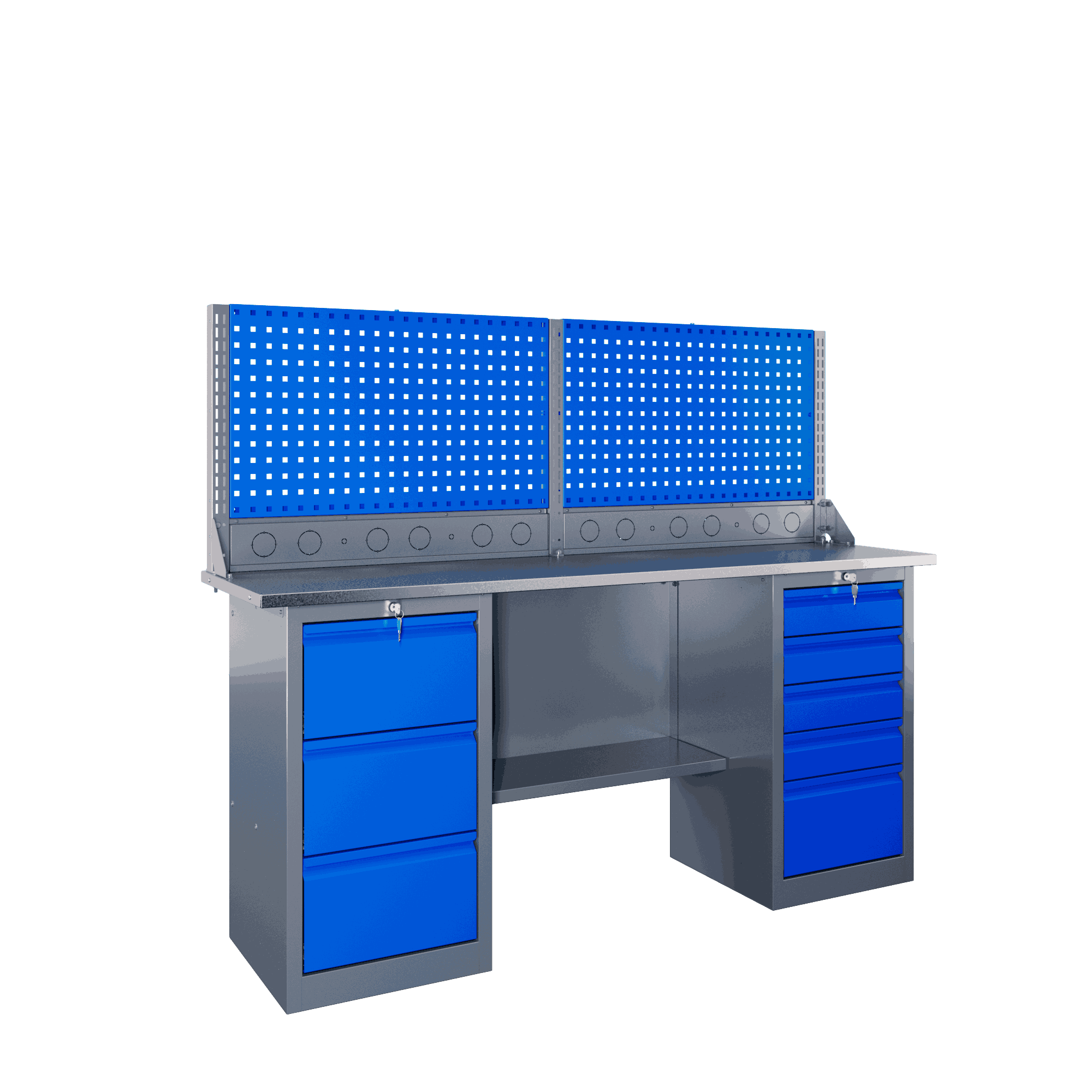 Задумайтесь о нагрузках: распределенная нагрузка достигает внушительных 500 кг, а вместительные ящики в тумбах выдерживают до 45 кг каждый. Габариты 1473x1800x500 мм (ВхШхГ) позволяют удобно размещать крупногабаритные детали. Ключевая особенность — столешница из фанеры толщиной 24 мм, усиленная оцинкованной сталью 1,2 мм. Такое покрытие не боится коррозии, воздействия масел и механических повреждений, а классическая перфорация 12х12 мм с шагом 38 мм позволяет использовать упоры для точной фиксации заготовок.