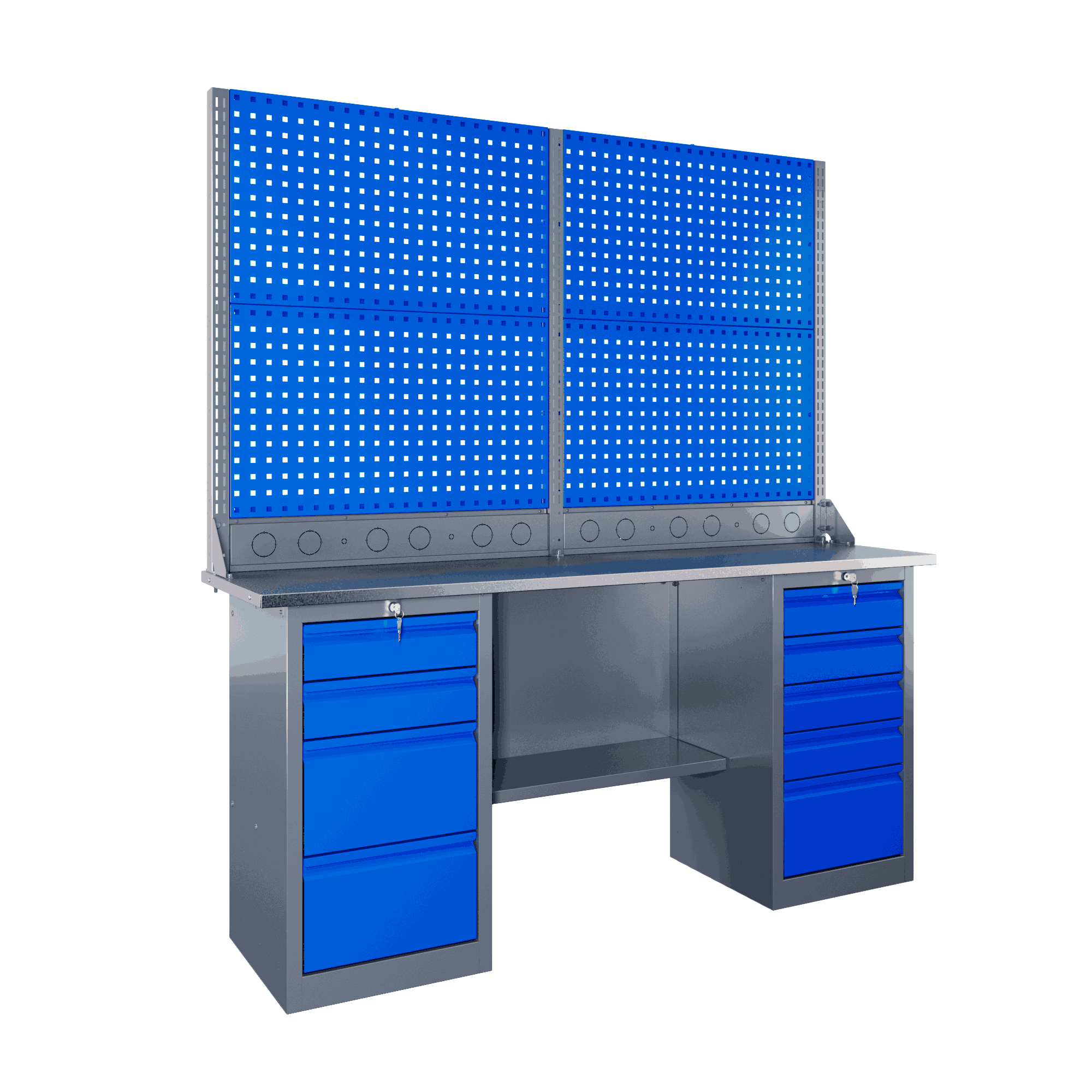 Самые компактные верстаки с глубиной столешницы 500 мм. Благодаря небольшой глубине, такие верстаки легко размещаются в ограниченных пространствах, например, в гаражах, мастерских и тд. Несмотря на компактные размеры, верстаки могут быть оснащены полками, ящиками и держателями для инструментов, что помогает поддерживать порядок и быстро находить нужные предметы.