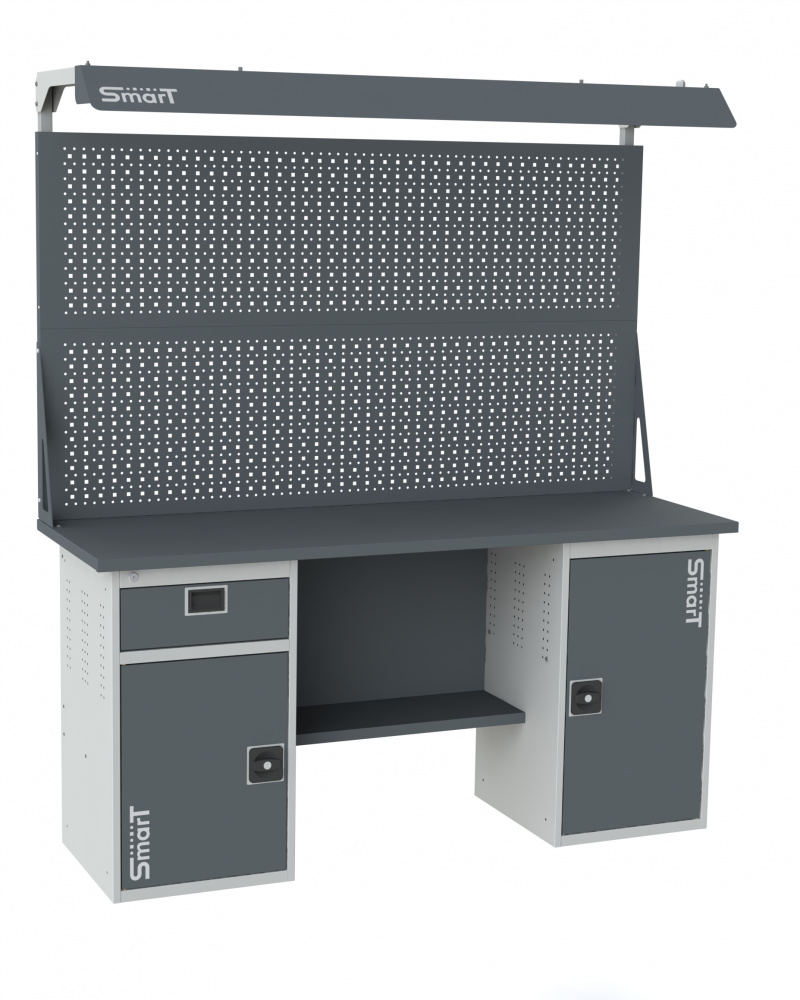 Универсальный металлический верстак серии Smart предназначен для обустройства легких производств, мастерских и гаражей. Все элементы изготовлены из высококачественной листовой стали, а покрытие устойчиво к механическим воздействиям и агрессивным жидкостям.