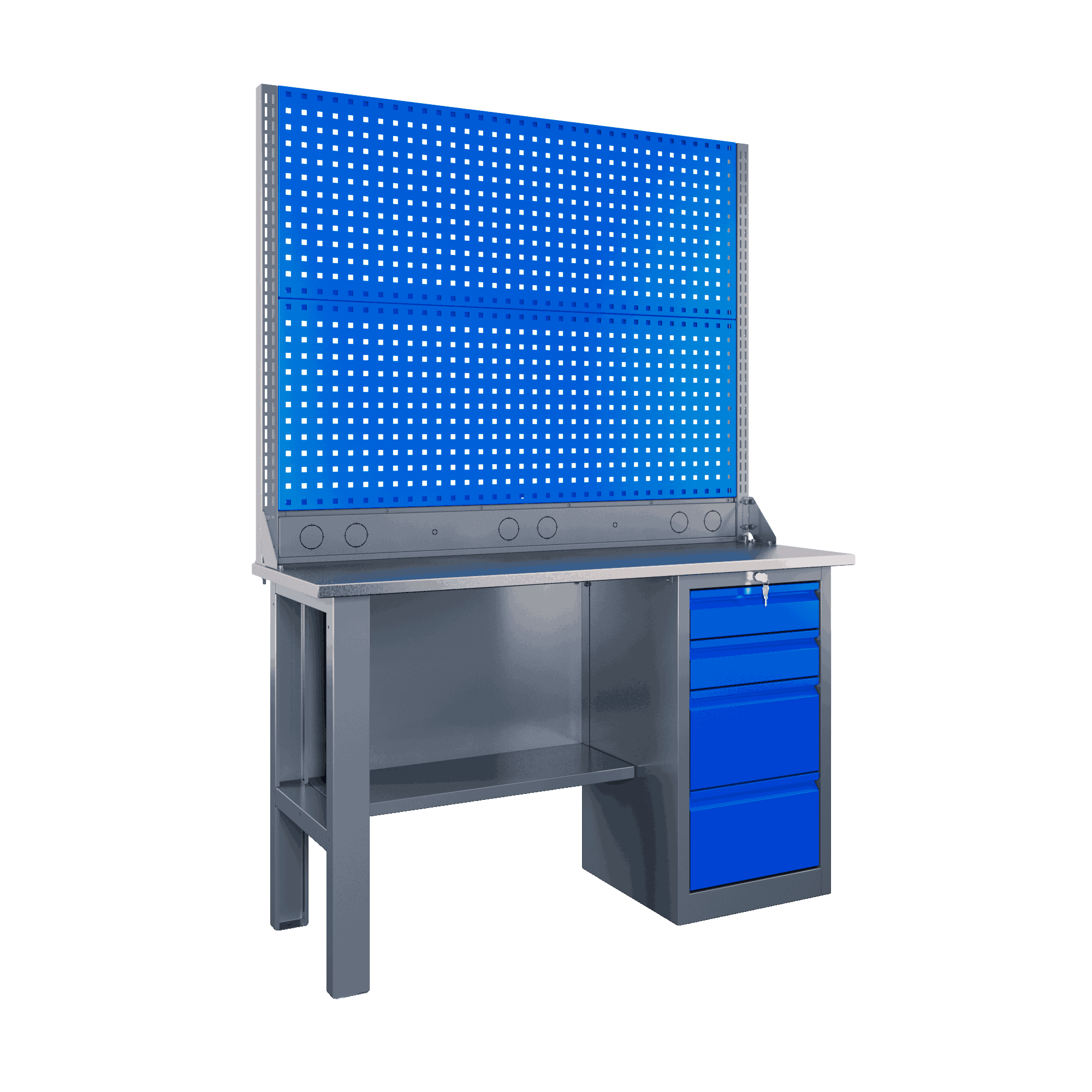 Этот профессиональный верстак от бренда «Верстакофф» создан для интенсивной работы в условиях высоких нагрузок. Модель сварной конструкции из стали выдерживает до 500 кг распределённой нагрузки, а четыре вместительных ящика (каждый до 45 кг) позволяют упорядочить хранение инструмента. Столешница из влагостойкой фанеры усилена оцинкованной сталью 1,2 мм – она не боится ударов, царапин и коррозии. Перфорация 12х12 мм с шагом 38 мм даёт возможность легко крепить полки, кронштейны и держатели.