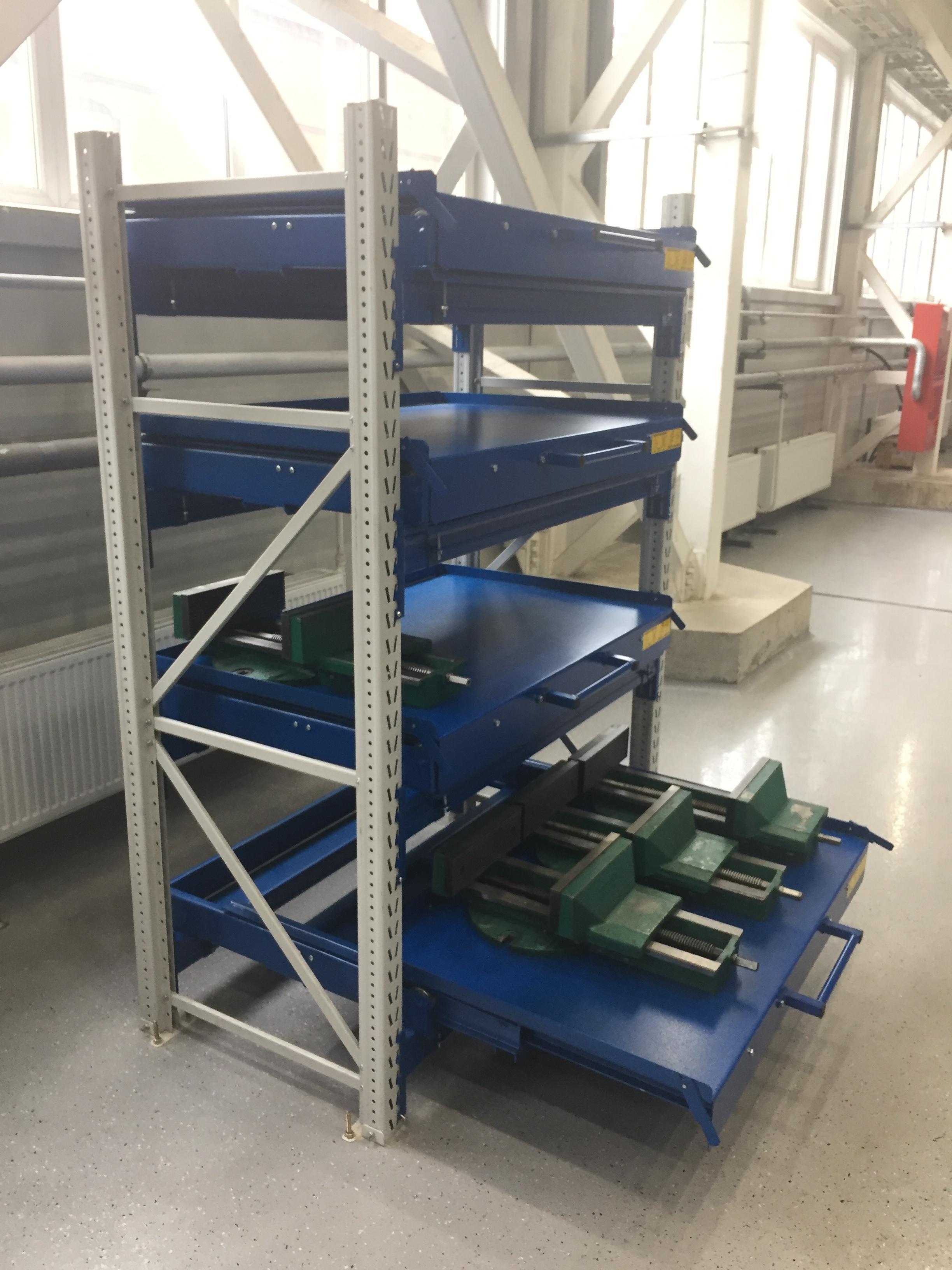 - Выкатная платформа на шарикоподшипниковых направляющих, закрепленных на балках стеллажа при помощи стяжных кронштейнов (4 шт/платформу), с ручкой и фиксатором (блокировка выкатывания)