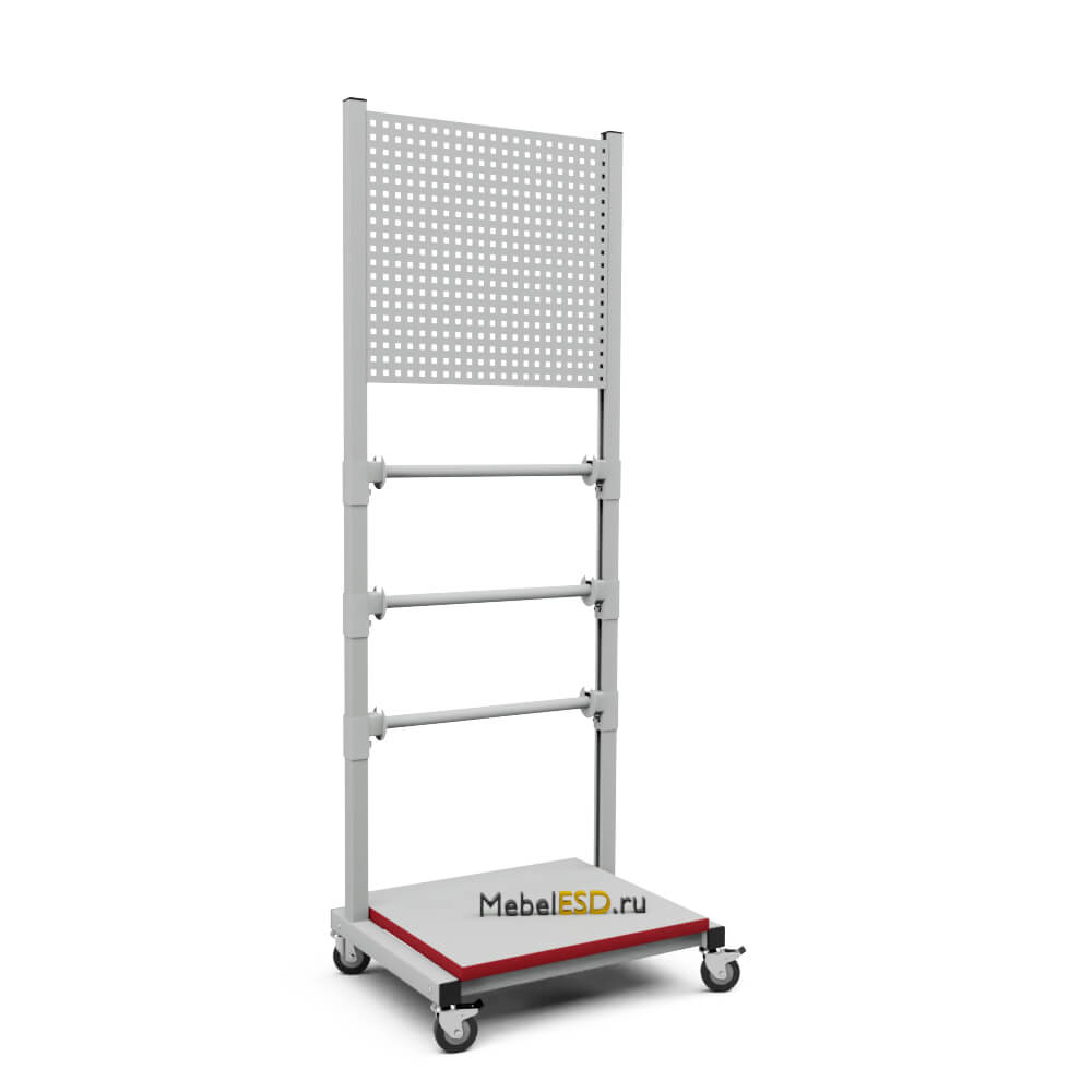 Стойка подкатная универсальная СРТ используется для хранения и перемещения рулонных материалов и инструментов в рабочем пространстве. В стандартной комплектации стойка поставляется в комплекте с панелью перфорированной ППМ и держателями для рулонов (3 шт).  Регулировка высоты держателей рулонов осуществляется по боковым стойкам. Конструкция стойки позволяет оснастить ее дополнительным оборудованием — полками, перфопанелями и планками для лотков. Стойка мобильная имеет металлический каркас, окрашенный порошковой краской.