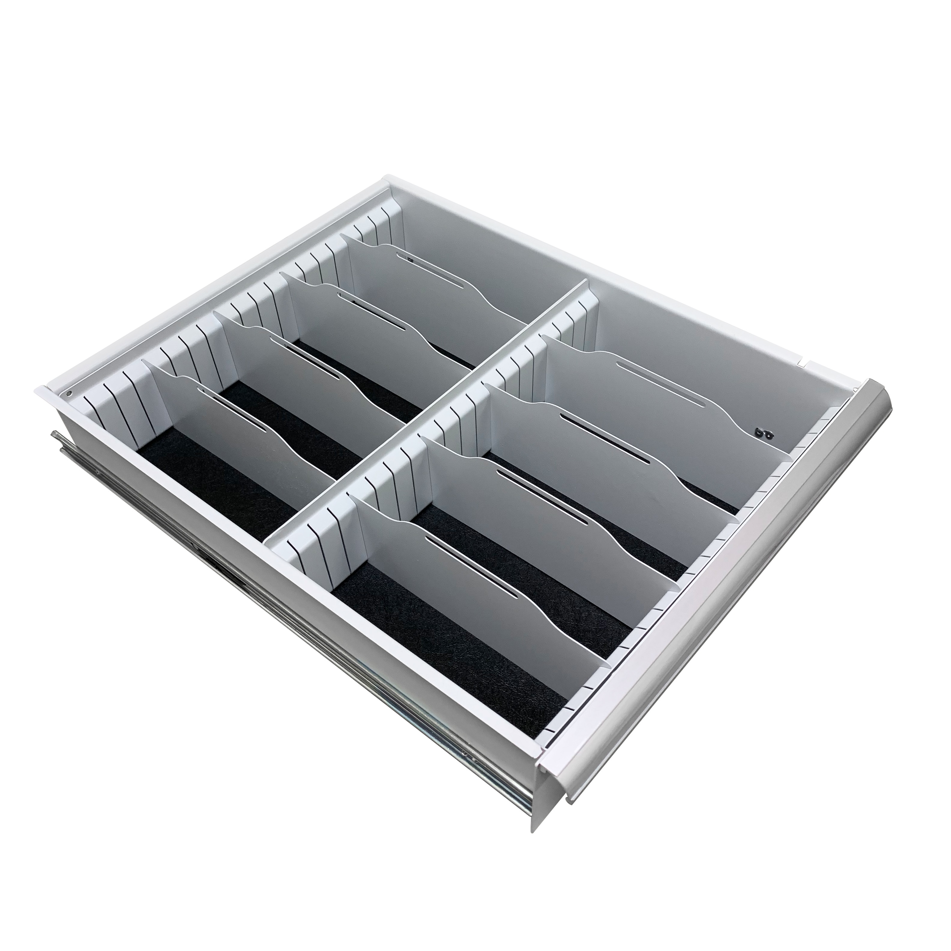 Комплект перегородок для ящика КП-Б (тип Б) используется для упорядоченного хранения комплектующих. Конструкция поперечных перегородок, которые имеют прорези по всей длине с шагом 20 мм, позволяет выстроить продольные перегородки таким образом, чтобы обеспечить оптимальный размер ячеек для разных по габариту материалов. Максимальное количество ячеек при использовании полного комплекта перегородок — 10 шт. Перегородки изготовлены из металла и окрашены порошковой краской светло-серого цвета RAL-7035.